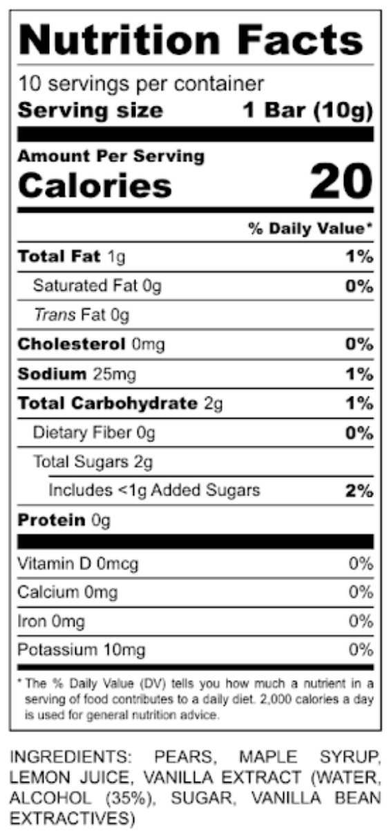 Nutrition facts for Vanilla Pear Fruit Jerky 3pk